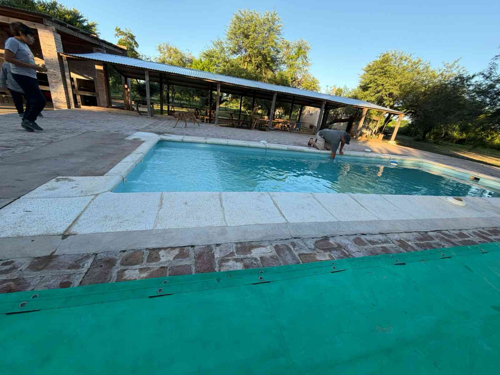 Sector de piletas con parrillero techado y quinchos para eventos.