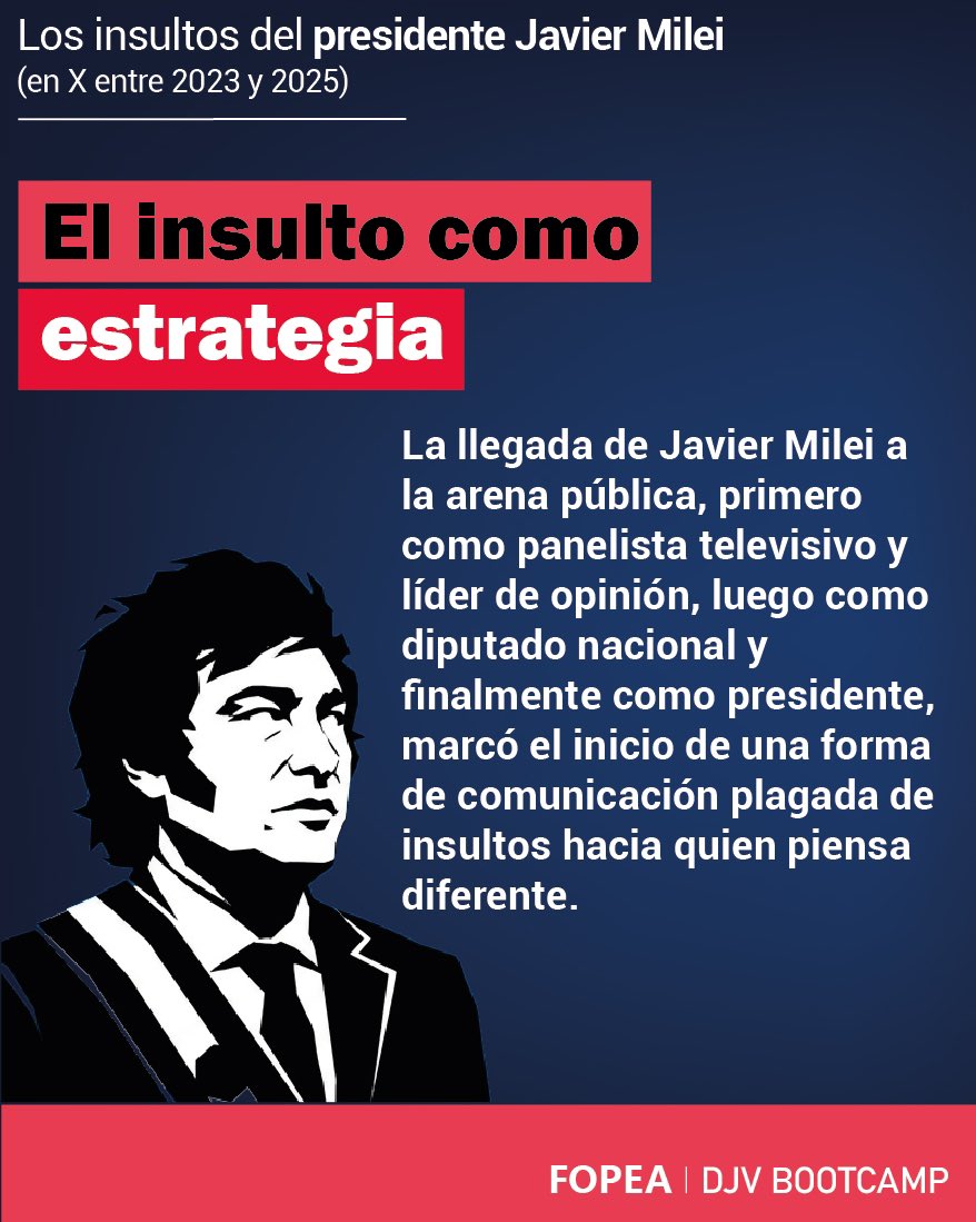 La investigación, titulada “El insulto como estrategia”, la realizó Data Journalism Visualization Bootcamp y analizó 113.649 posteos que publicó Milei entre el 10 de diciembre de 2023 y el 15 de septiembre de 2025, período que abarca el inicio y desarrollo de su gestión presidencial.