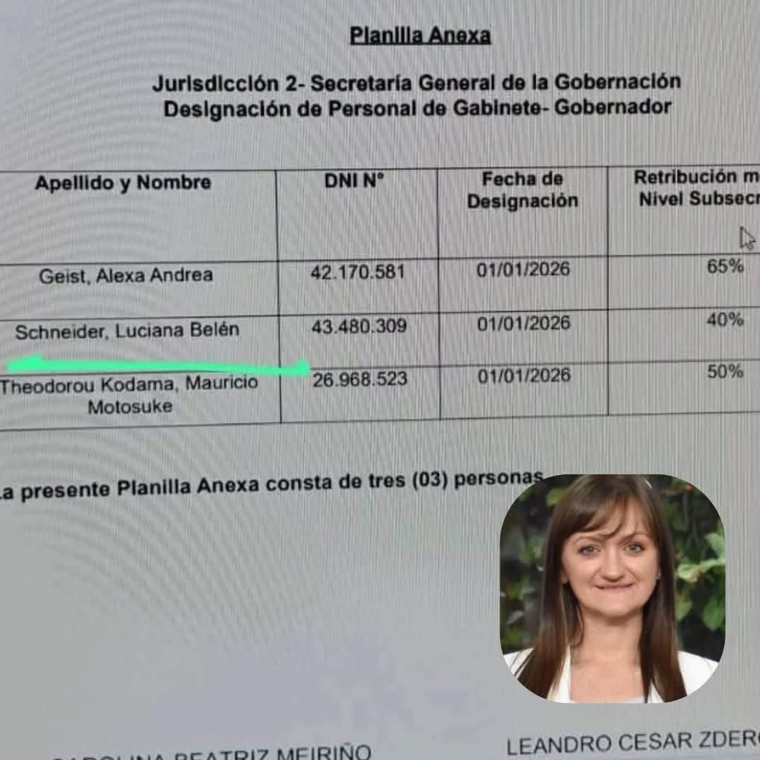 Según las informaciones que circulan, Luciana Belén Schneider, prima de la senadora —hija del primo hermano Germán Schneider y parte del círculo de confianza de Silvana desde su etapa como vicegobernadora— fue incorporada en un cargo estratégico en la Secretaría General de la Gobernación cuando la senadora asumió su banca en el Senado. La caracterización que hacen críticos y opositores es contundente: se trató de una reubicación que garantizó continuidad laboral y un sueldo estable en el Estado, aun cuando muchos chaqueños perdían su trabajo.