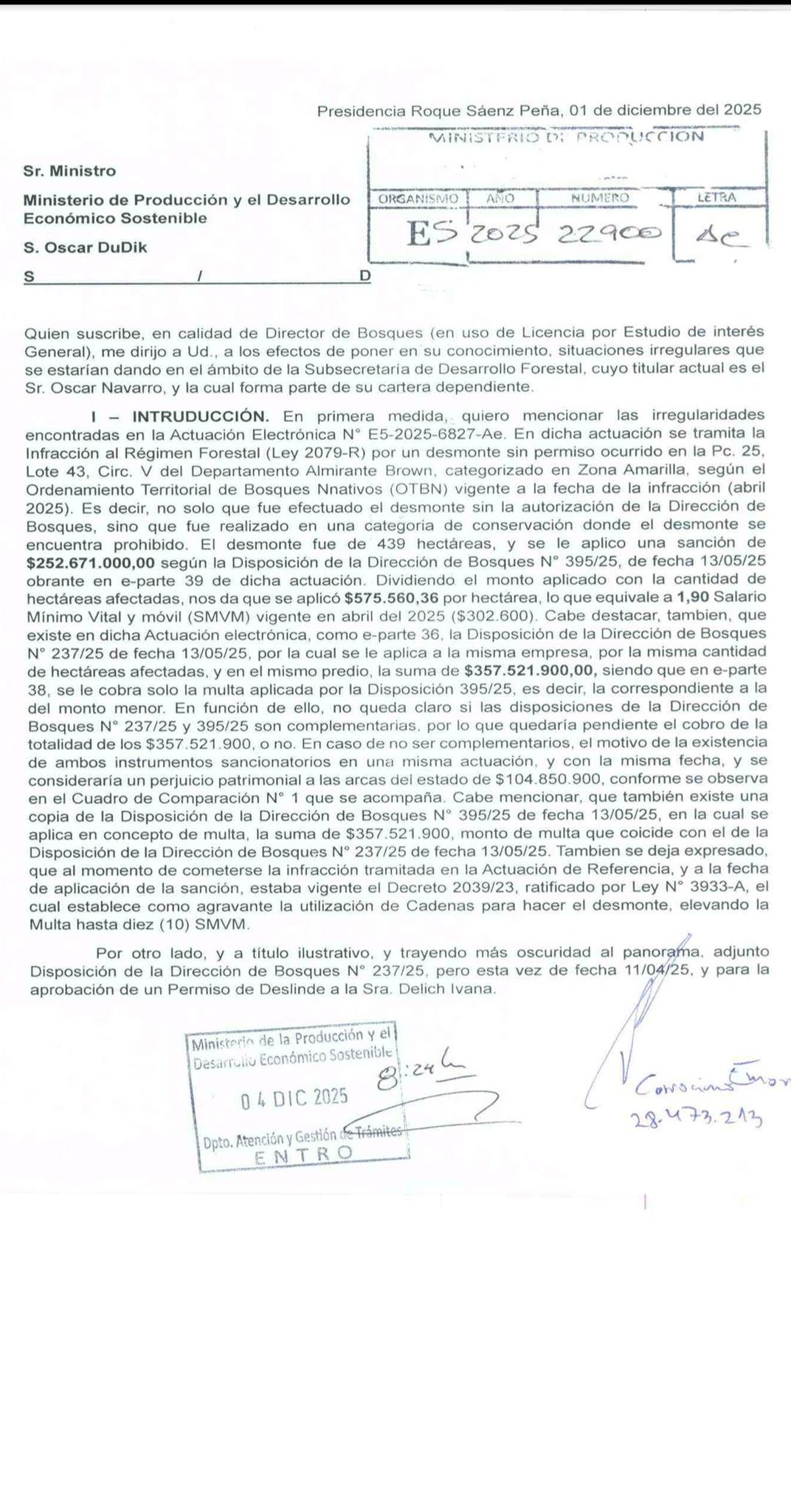 Pero la situación no termina allí. La presentación también advierte sobre serias irregularidades en actuaciones administrativas vinculadas a desmontes ilegales, particularmente en el expediente electrónico E5-2025-6827-Ae, relacionado con un desmonte sin autorización ocurrido en abril de 2025.