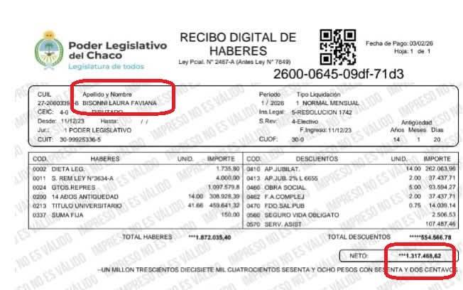 En un clima de creciente tensión social y económica, la diputada oficialista Laura Bissoni desató una fuerte controversia tras intentar victimizarse por sus ingresos mediante la publicación de su recibo de sueldo. Según la imagen difundida por la legisladora, sus haberes mensuales se sitúan en torno a los $1.300.000, una cifra que ella misma comparó con el salario de un empleado de supermercado para justificar su postura. Sin embargo, la estrategia de transparencia de la diputada del bloque “Zderista” fue rápidamente puesta bajo la lupa al salir a la luz millonarias cifras adicionales que no figurarían en el recibo de haberes tradicional, pero que forman parte integral de sus beneficios como funcionaria.